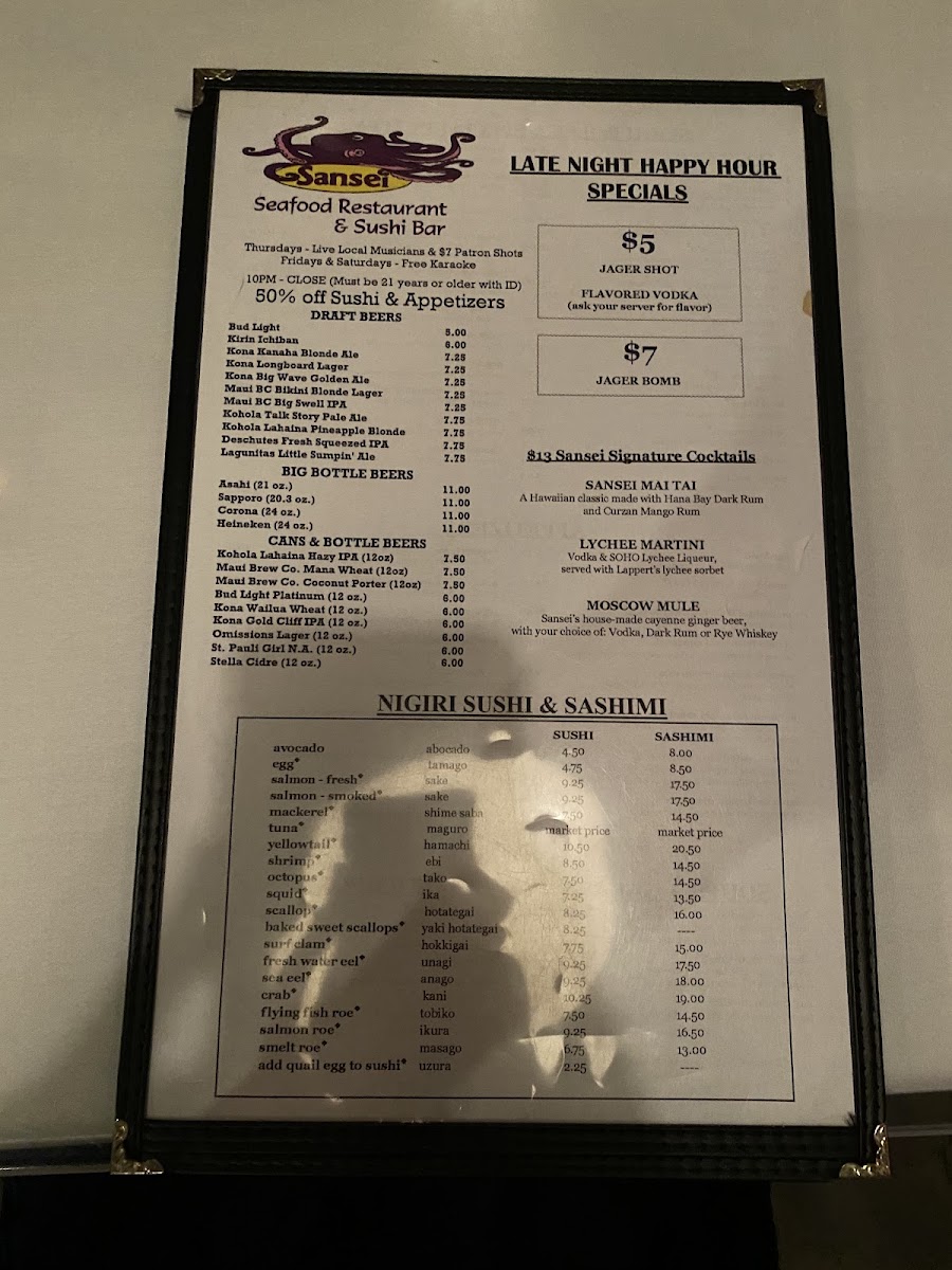 For those looking to quench their thirst, Sansei offers an assortment of refreshing beverages, including mocktails and local draft beers like the Kona Gold Cliff IPA or Deschutes Fresh Squeezed IPA, surrounding you with tropical flavors that perfectly complement your meal.